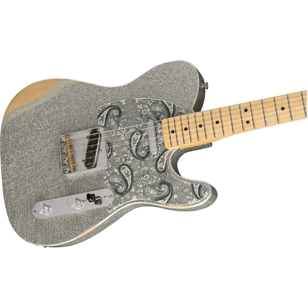 In addition to the modern 9.5″ radius fingerboard and medium-jumbo frets (ideal for fast playing and big bends), the Brad Paisley Signature Telecaster is host to a number of juicy extras. The unique finish is referred to as “Silver Sparkle”, and has been given some road-worn finishing touches to give the impression of a well-used, well-loved instrument. There’s also a clear custom pickguard with black and silver paisleys, as well as Brad’s cowboy hat insignia on the headstock.