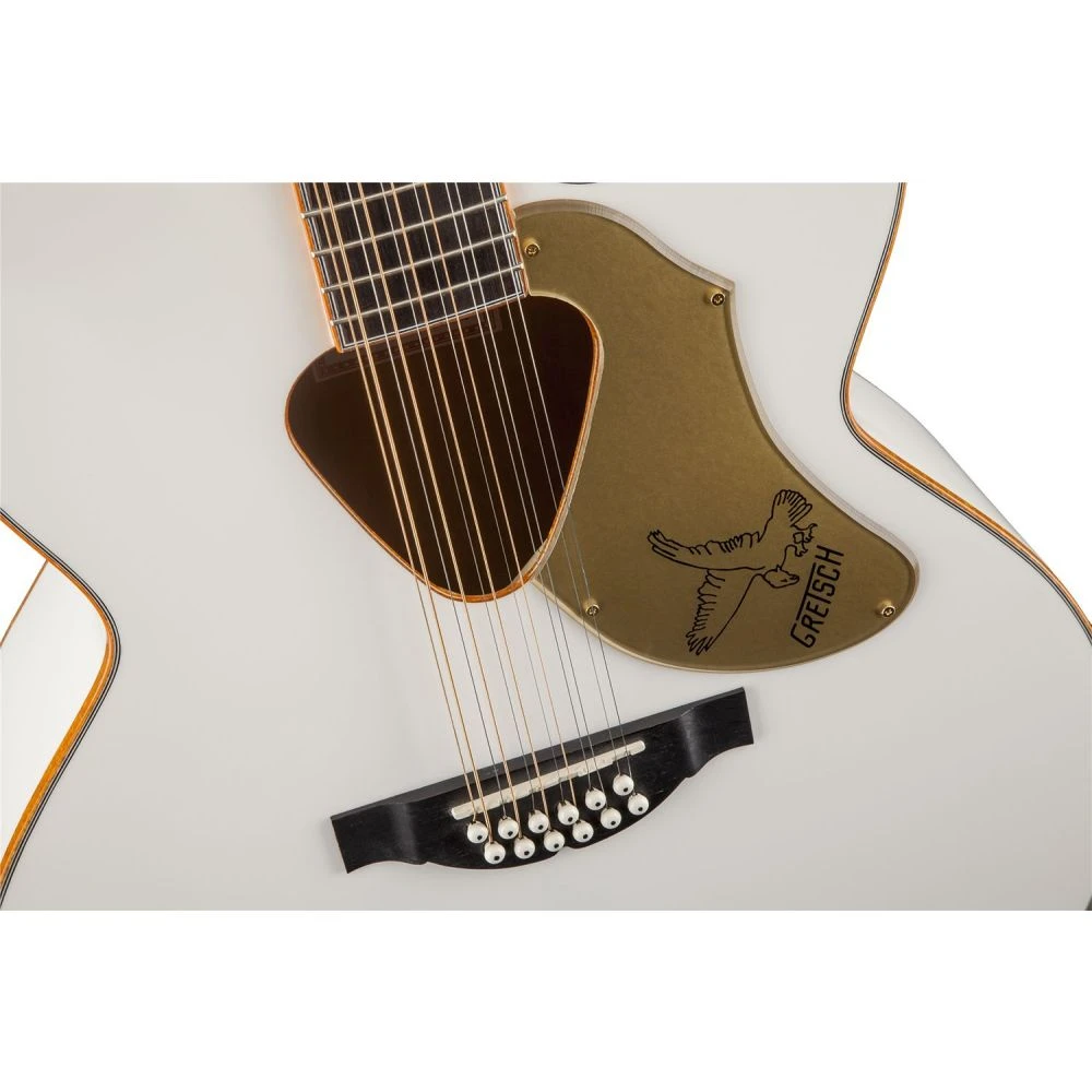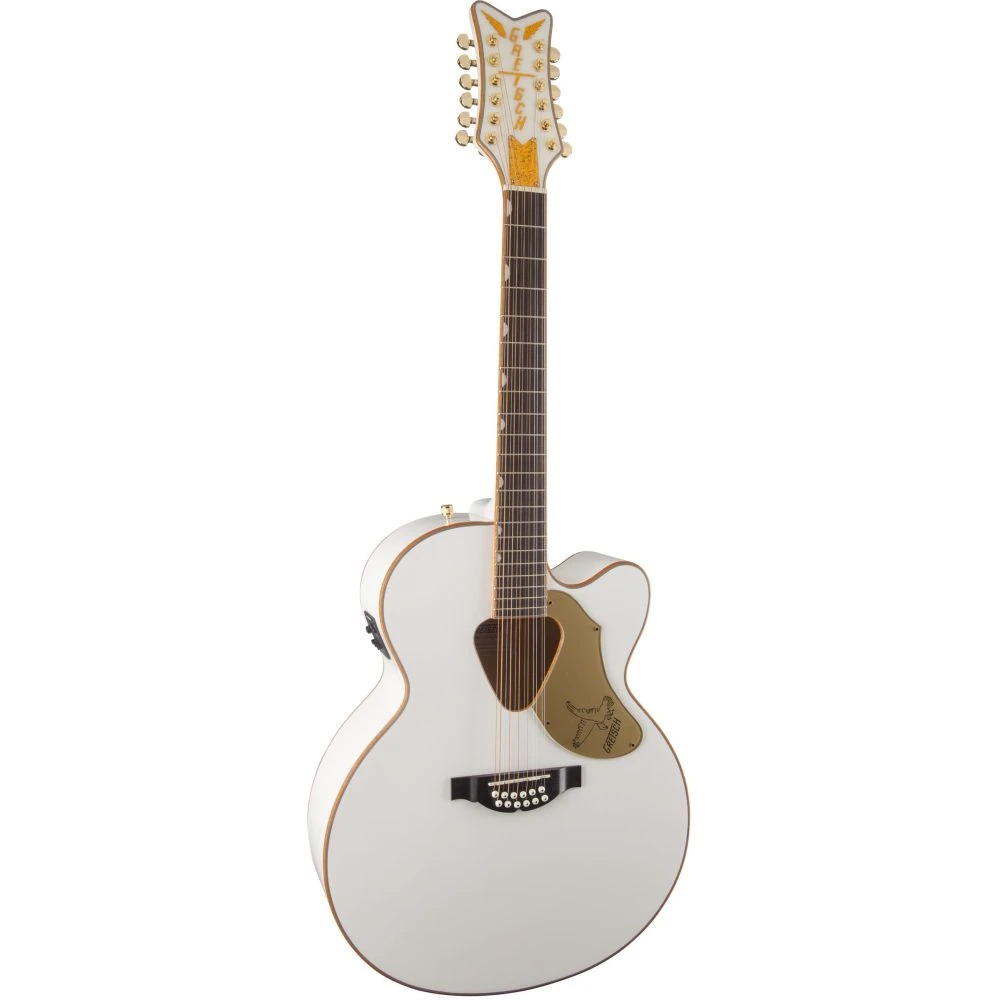 The Gretsch G5022CWFE 12 ng Ele Acoustic Guitar’s cutaway body is finished in gloss white, with dazzling gold-sparkle binding. Other premium features include a solid spruce top with scalloped “X” bracing and classic Rancherangular sound hole. The Fishman Sonicore under-saddle pickup and Isys+ preamp system provide great amplified performance, with volume, tone and phase cols.