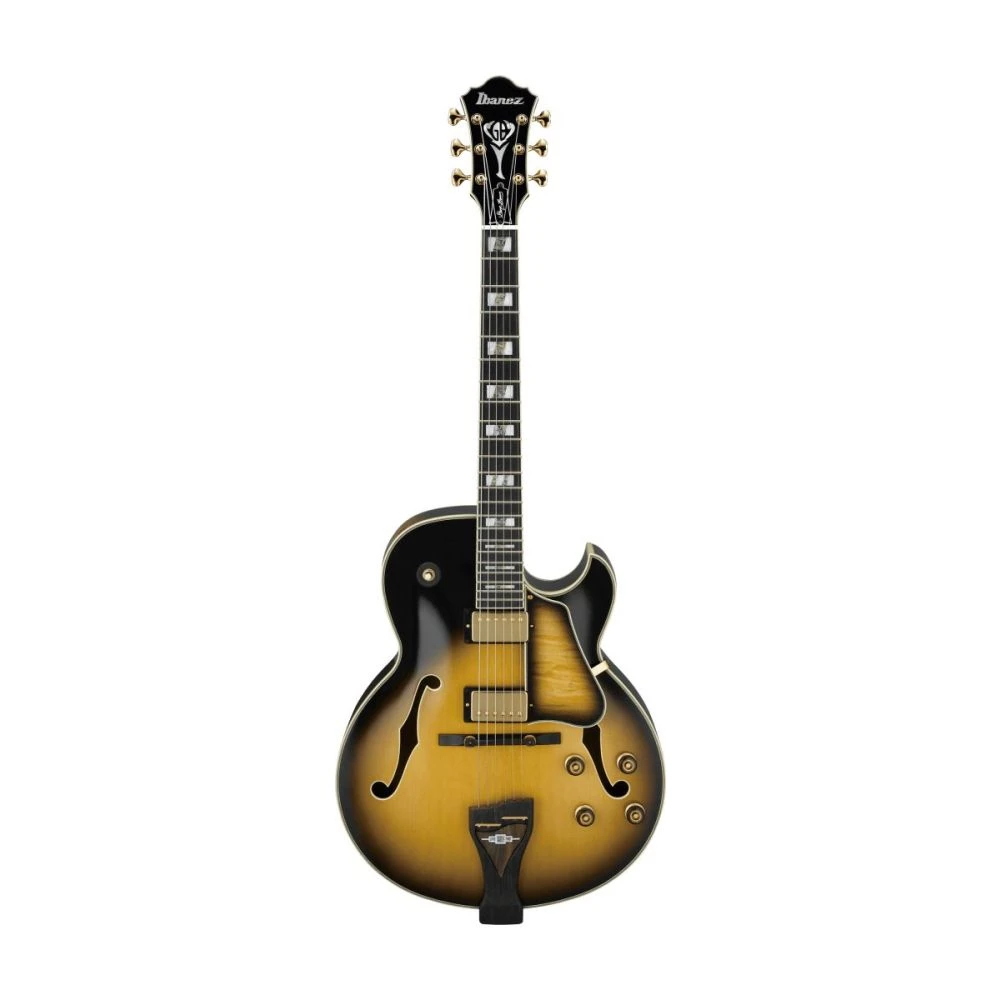The Ibanez LGB300 George Benson signature guitar, seen here in a gorgeous Vintage Yellow Sunburst, gives you authentic George Benson sound and style.