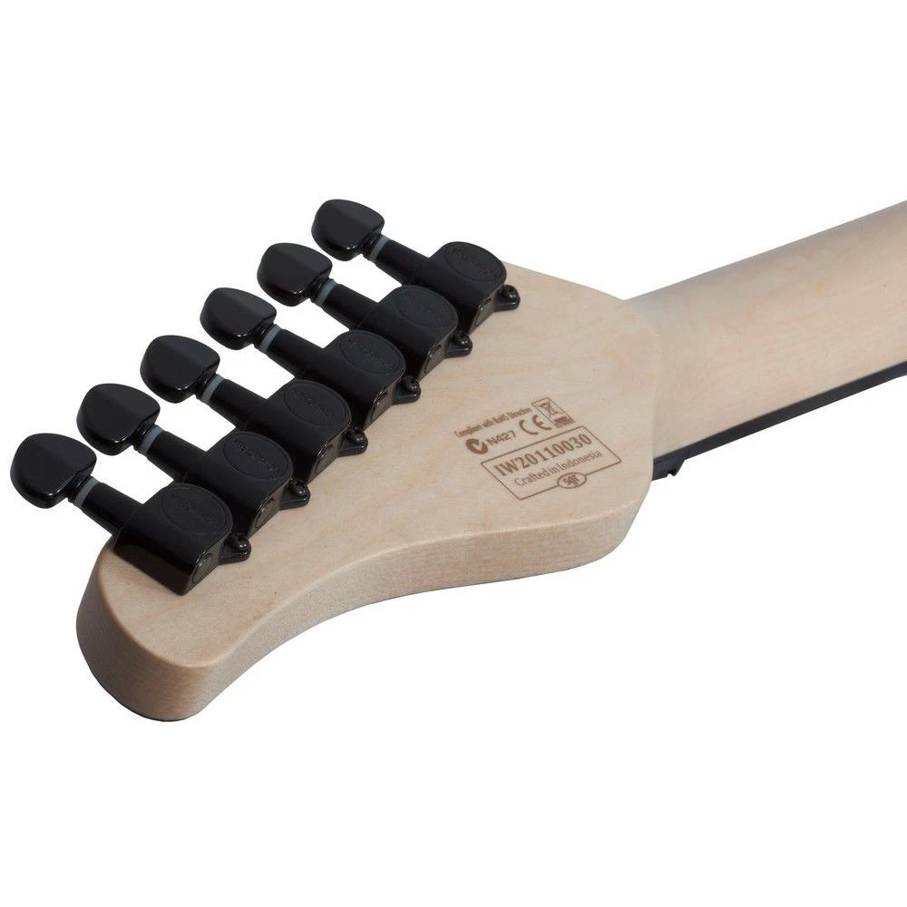 The Maple neck is an extremely playable thin ‘C’ shape and features a Ebony fretboard with offset reverse dots for fret markers. X-Jumbo frets make playing fast extremely easy, suiting fast metal and shredding styles down to the ground.