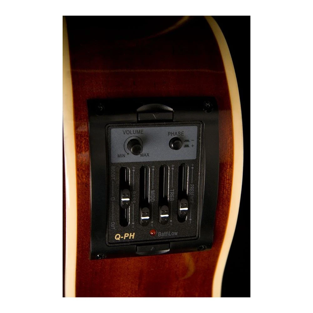 The AB5 acoustic bass features one of Washburn’s own premium Equis acoustic pre-amplifiers. The pre-amp is powered by a 9V battery and receives its signal from a piezo-pick up fitted in the bridge. Also on the Washburn AB5, you’ll find some powerful EQ options allowing you to adjust bass, mids, treble and the overall ‘presence’. An integrated “Phase” button allows you to switch the phase of your audio signal to help eliminate feedback when performing.